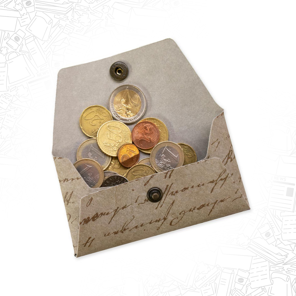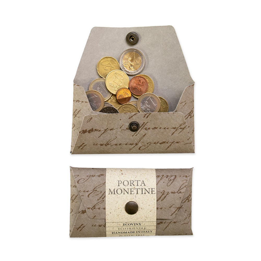Portamonete in Ecovinx. L’Ecovinx è realizzato con cellulosa composta da fibre provenienti da scarti di lavorazione con certificazione FSC. L’effetto invecchiato e stropicciato della carta-tessuto è derivato da un particolare trattamento conciario. Ecovinx è il materiale con cui si realizzano le etichette dei jeans, è lavabile e resistente agli strappi e all’usura.