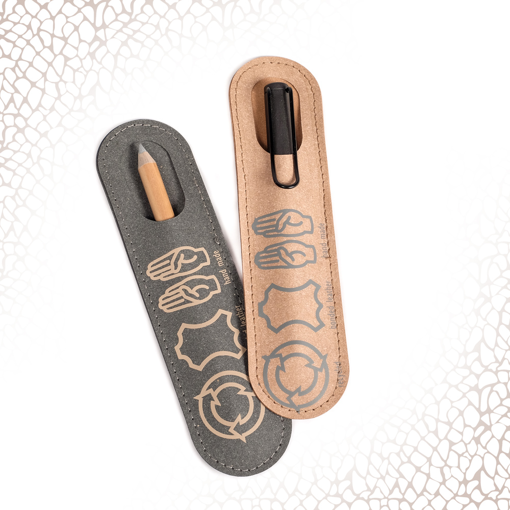 Portapenne in pelle riciclata. Gli scarti di pelle vengono riutilizzati nel ciclo produttivo macinando e poi aggiungendo lattice e grasso naturale come leganti. La pelle riciclata è morbida, piacevole al tatto e ha l’odore della pelle naturale.