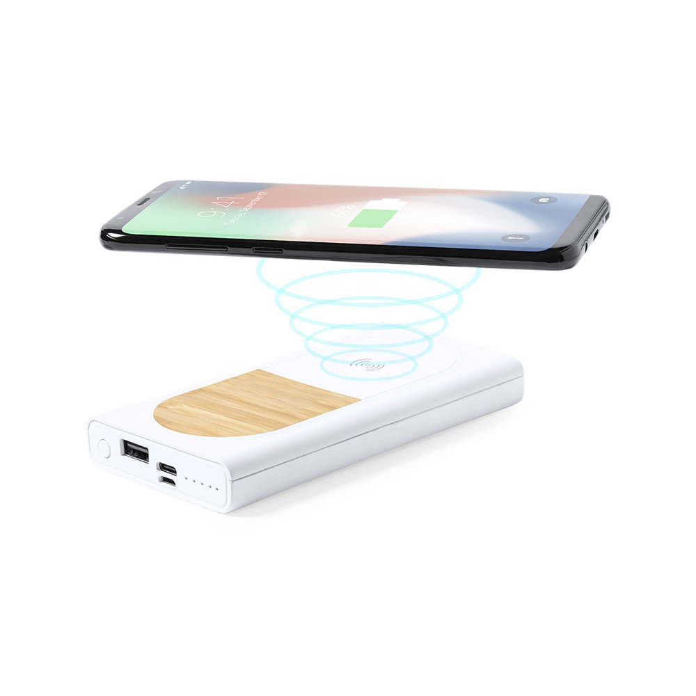 Powerbank Wireless 15W. 8000 mAh. 1 Output USB e 1 Tipo C. Input Micro USB e Tipo C. Il materiale con cui è fatto è un mix tra bamboo e PLA 100% compostabile