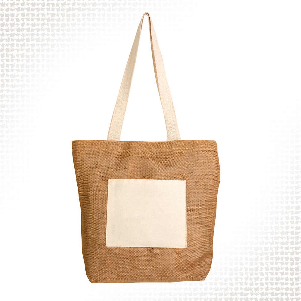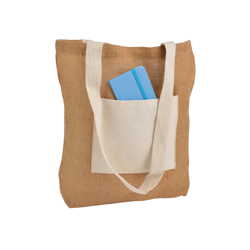 Shopper con soffietto alla base in juta con manici e tasca esterna (18 x 15 cm) in cotone naturale, dall’elegante design della juta e comodi manici