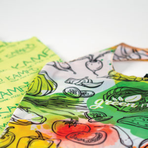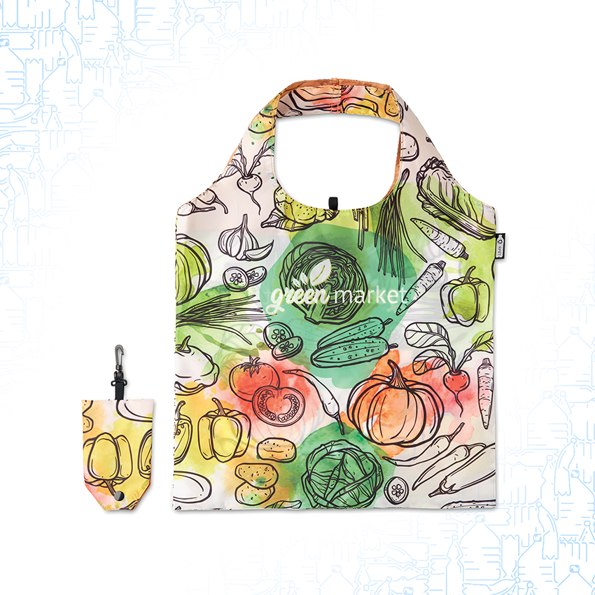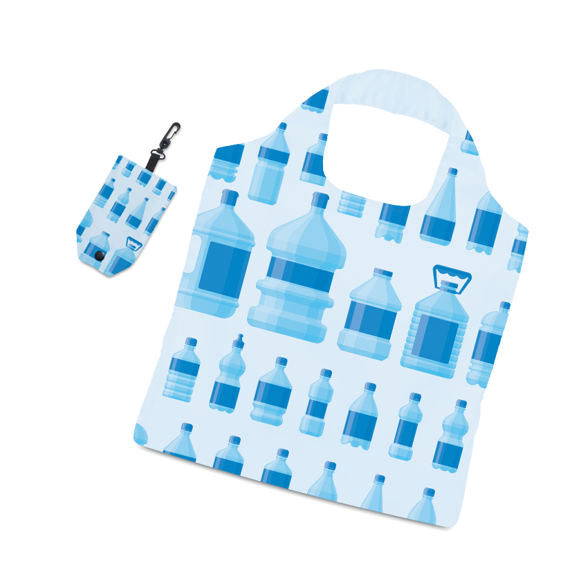 Borsa shopper pieghevole in PET riciclato, in custodia, con anello in plastica. Misura: 39x50cm. Misura ripiegata: 13x2x8cm. Opzionale: etichetta in tessuto con logo “RPET”.