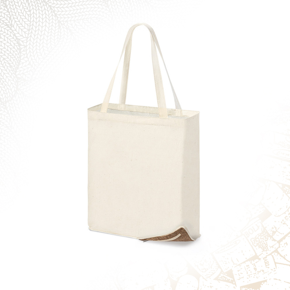 Shopper pieghevole 100% cotone da 110 g/m2 e base in sughero naturale, provvista di tasca. Manici da 57 cm con rinforzo, finitura cucita e resistenza fino a 8 kg di peso. Ripiegabile in ridotte dimensioni con chiusura a cerniera per un facile trasporto. Dimensioni: 34.5x10x39 cm