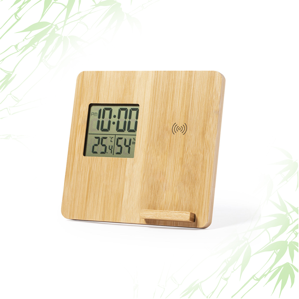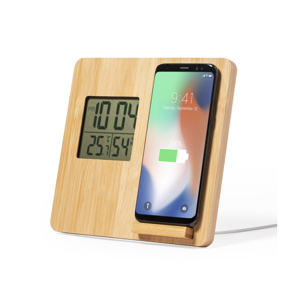 Stazione meteorologica in bamboo con una zona per caricare wireless il vostro cellulare. Potenza Wireless 10W. Orologio e temperatura presenti.