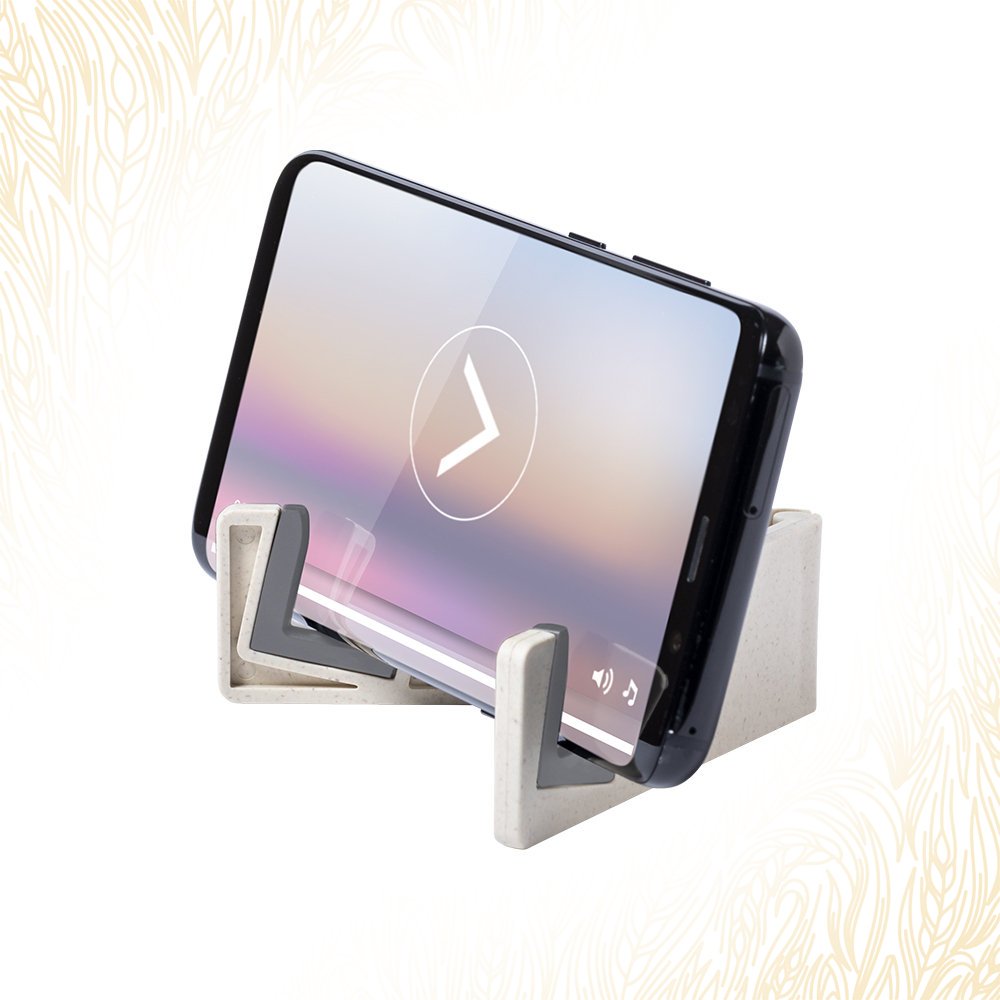Supporto per smartphone realizzato in fibra di grano, al fine di promuovere l’utilizzo di materie prime naturali e ridurre le emissioni inquinanti. Piedini pieghevoli con fermi in PVC antiscivolo, appositamente progettati per la stampa in tampografia.