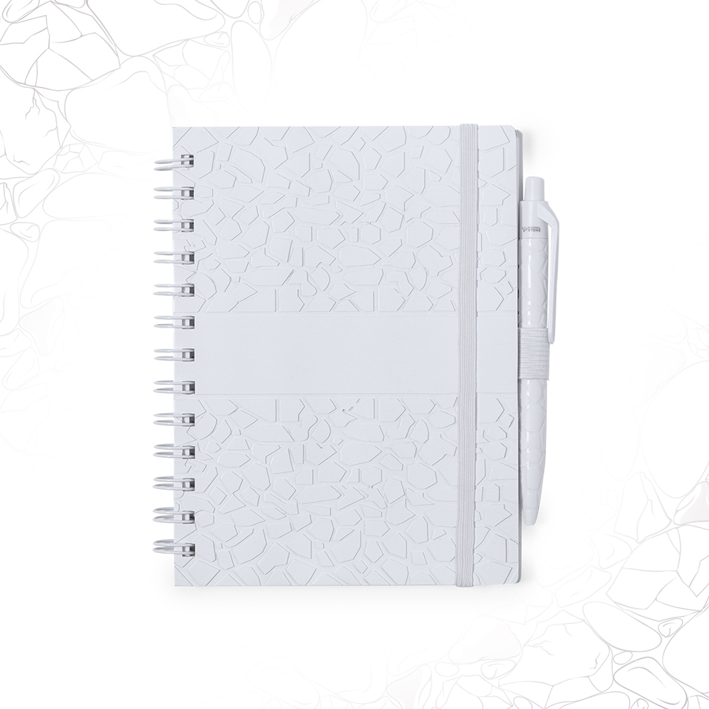 Set composto da taccuino e penna. Taccuino ad anelli con copertina rigida in estratti di pietra in elegante finitura bianca e portapenna. Copertina con design in rilievo. 70 fogli bianchi a riga singola, con logo Natural Stone. Penna con fusto intagliato con estratti di pietra naturale, che contribuisce a ridurre l’uso di materie plastiche e fornisce una finitura liscia e resistente. In bianco con logo Natural Stone sulla parte superiore. Cartuccia Jumbo e inchiostro blu.