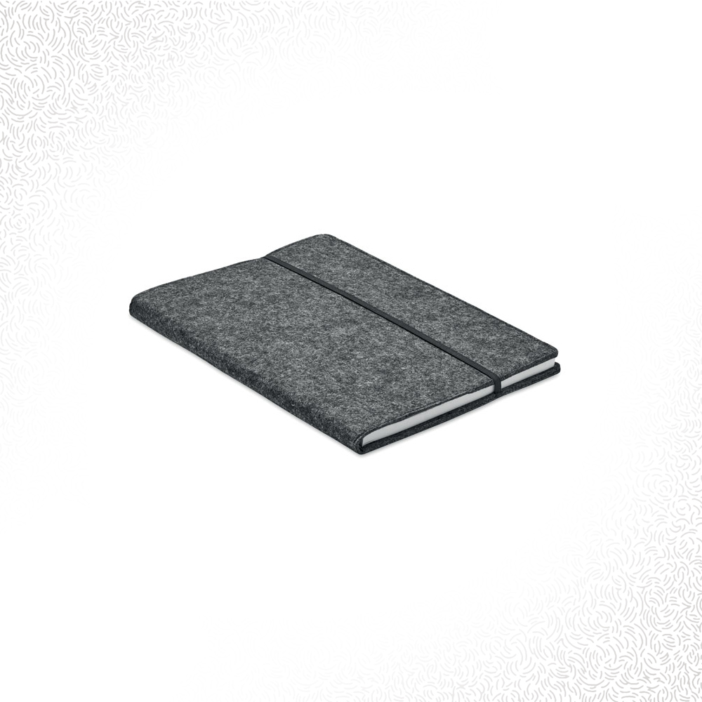 Notebook A5 con copertina in feltro RPET. 160 pagine foderate in carta riciclata (80 fogli / 70 gr/m²). Portapenne.