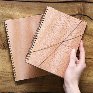 Taccuino con copertina in legno tranciato sottilissimo e supportato in carta. La copertina è realizzata con legno proveniente dagli avanzi dell’industria del mobile. Ogni quaderno è un pezzo unico: la diversa combinazione di essenze, l’armonia dei disegni naturali del legno, fino ai colori degli interni e della pratica chiusura, rendono questi prodotti originali. La possibilità di personalizzarli con un’elegante incisione li rende ancora più esclusivi.