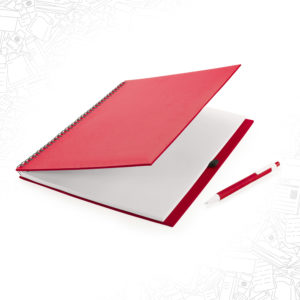 Quaderno a spirale con 80 fogli bianchi e cover soft-touch in resistente cartone riciclato. Dotato di penna a sfera in cartone riciclato dal colore coordinato e relativo porta penna sul retro.