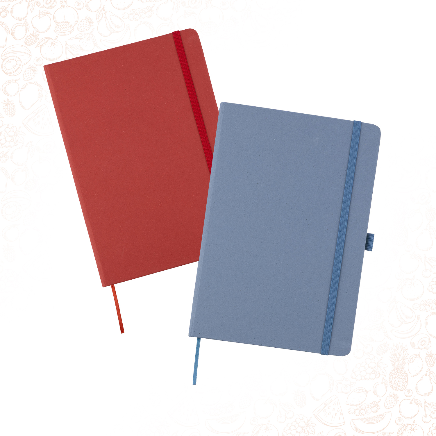 Taccuino in cartone e rifiuti organici riciclati, formato +/- A5, 80 pagine a righe stampate con inchiostro di soia, include logo ‘scarti riciclati’ stampato a caldo sul retro, diverso per colore: verde per agrumi, rosso per ciliegia, blu per lavanda, kaki per uva, marrone chiaro per mandorla, copertina rivestita in carta Favini (made in Italy) 70 gr/m²