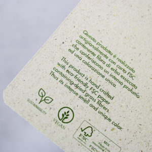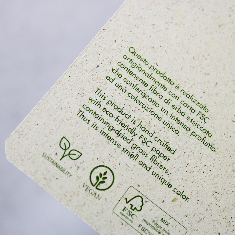 L’intenso profumo e la caratteristica colorazione rendono il taccuino accattivante e al tempo stesso una valida proposta nel segno della sostenibilità poiché mix di erba essiccata e cellulosa vergine certificata FSC.