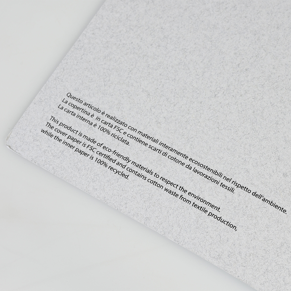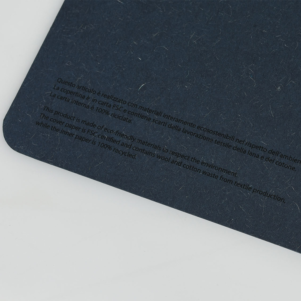 Taccuino con copertina ricavata dal riciclo di scarti industriali di lana e cotone e pagine interne in carta FSC. Un articolo unico nel suo genere in cui si percepisce al tatto la sensazione dei filati e le fibre di tessuto creano un particolare contrasto sulla superficie.