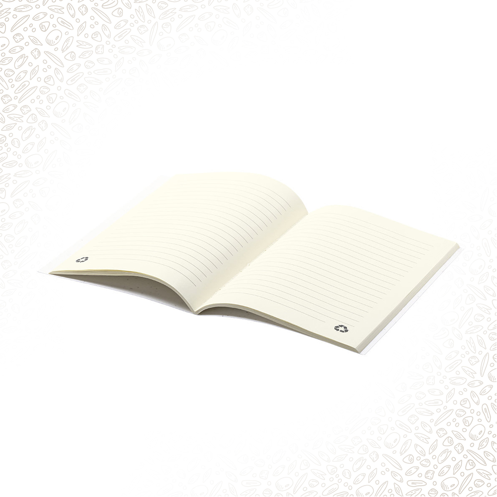 Taccuino formato A5 con copertine in carta riciclabile e degradabile.